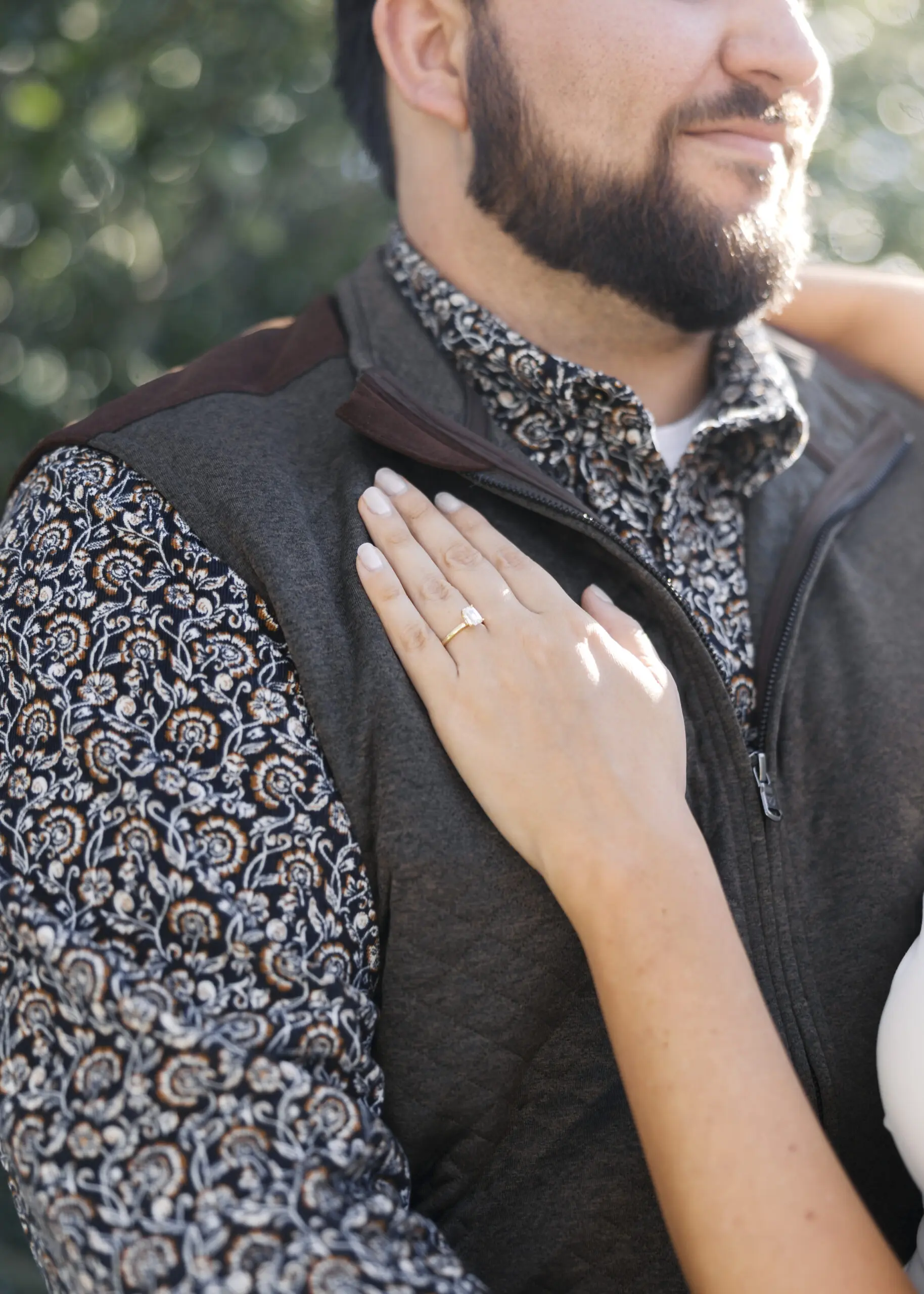 I had 0 expectations as to what I wanted an engagement ring to look like so I needed to go and try on for myself. I had always thought I wanted oval cut but soon learned that was not for me. We started trying on emerald cuts and i immediately loved the way it looked on my finger. I have always been a gold girl so knew I wanted a gold band and a simple diamond and that is exactly what I got! We settled on a hidden halo and I left Lane with the task of surprising me with what would be on the side and I’m so happy he picked baguettes. Those were my favorites!