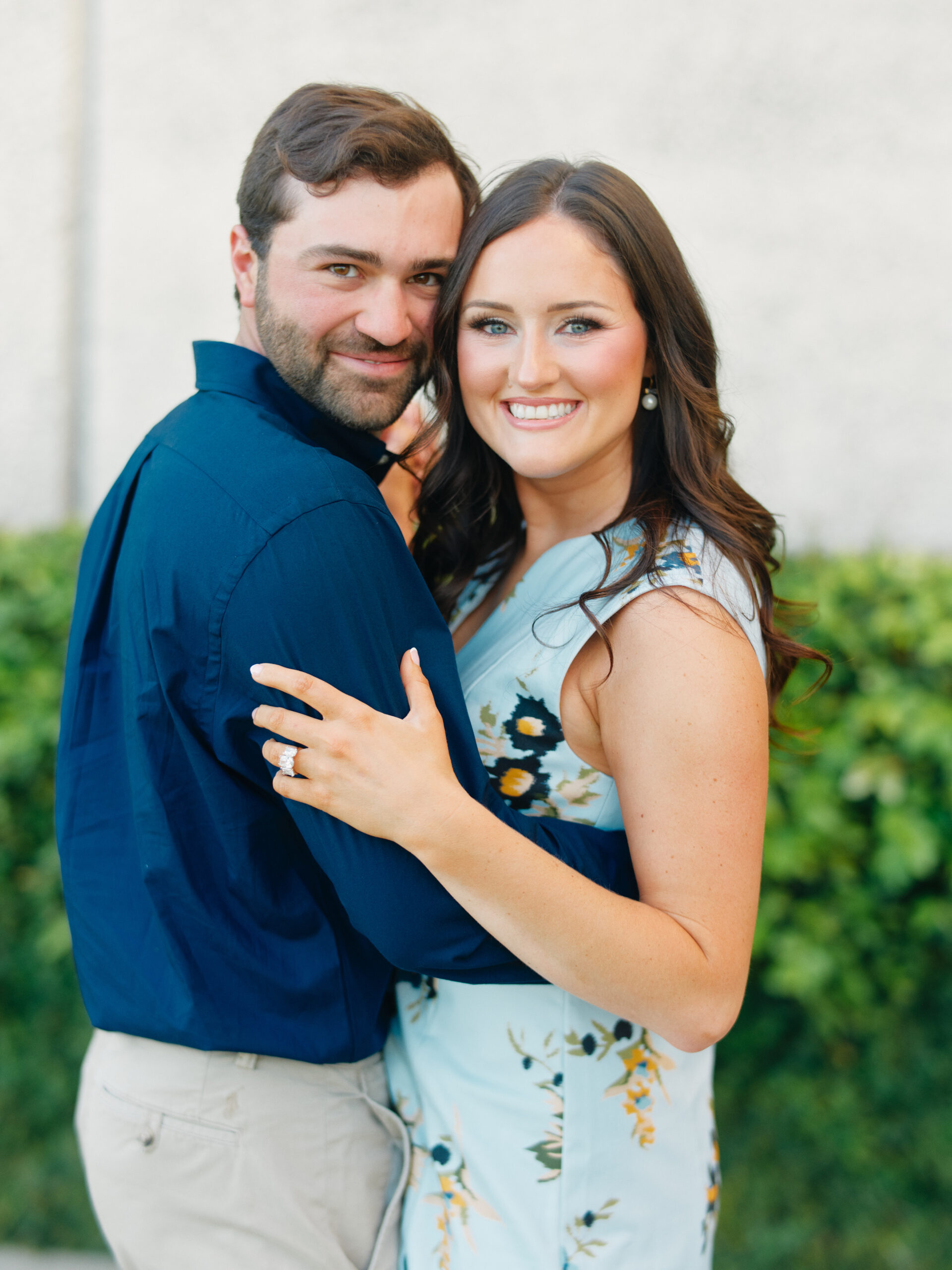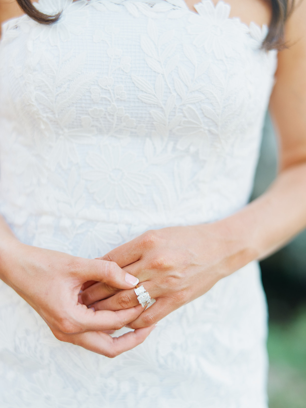It’s a cushion cut center stone with two radiant stones on each side, and I love how classic and elegant it looks while still feeling unique. Even though we designed it together, the moment he proposed was still such a sweet surprise.