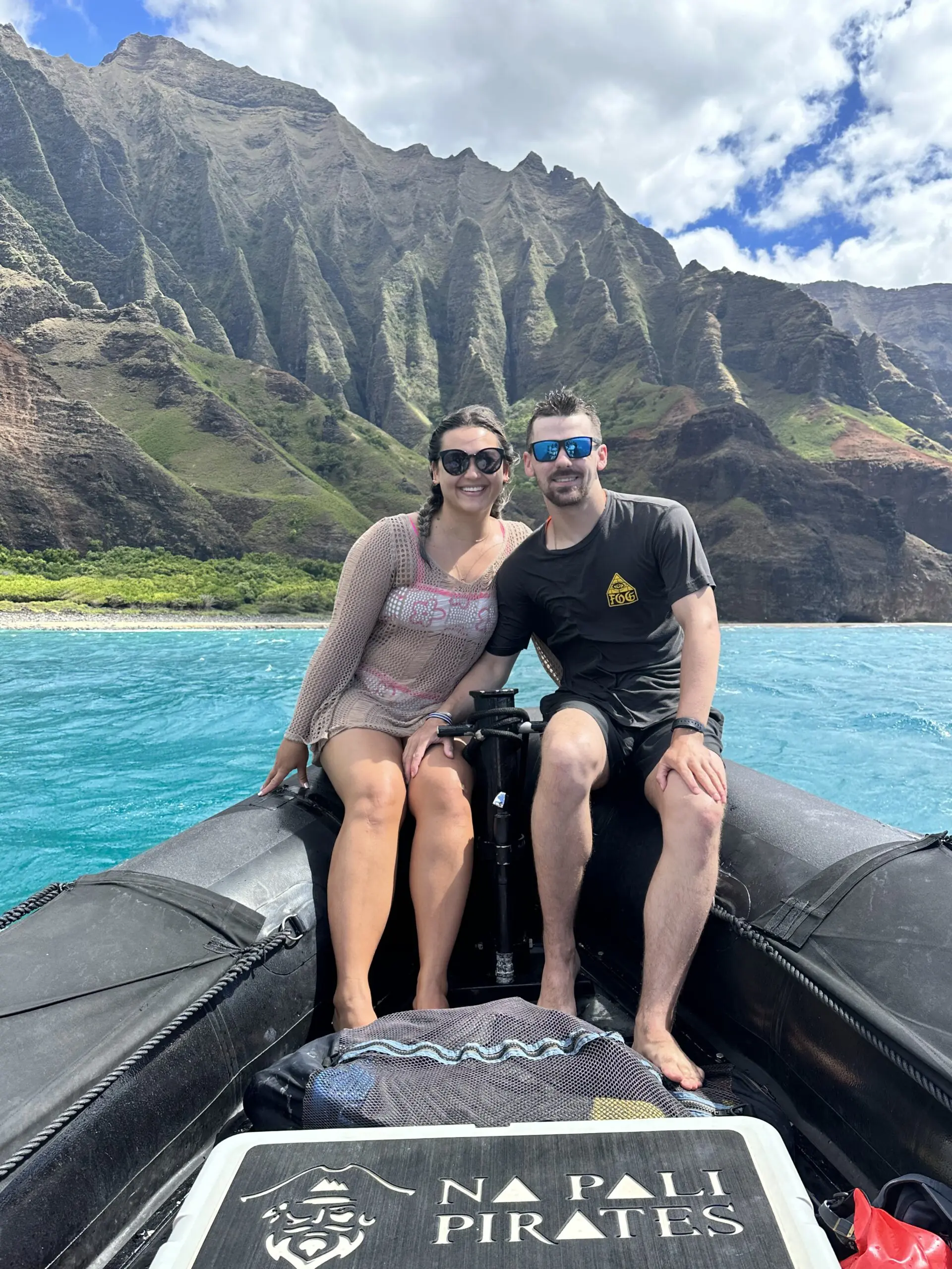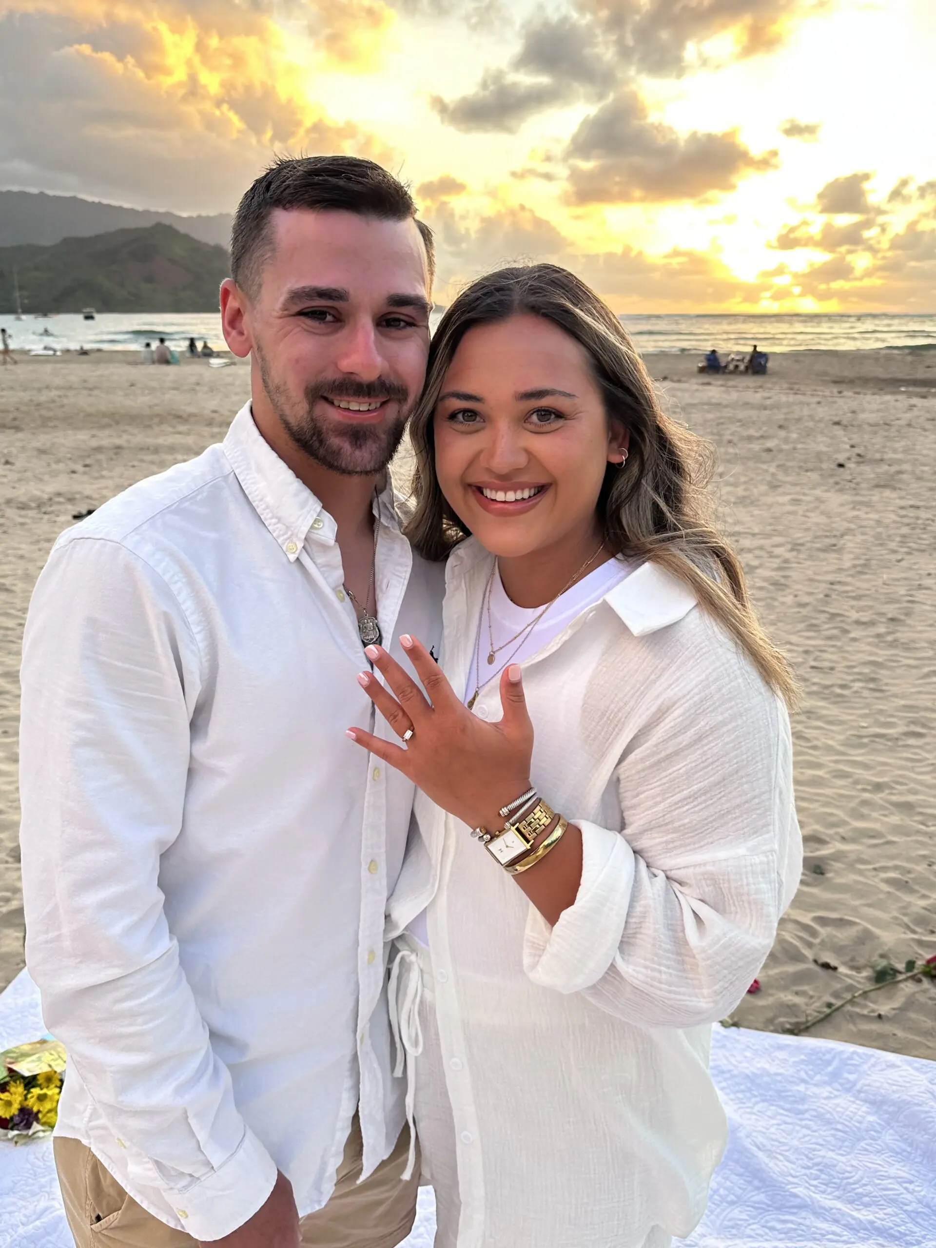 After working a travel assignment for three months on the Big Island of Hawaii, Nathan and I planned to meet in Maui to start our 10 day trip island hopping and exploring. Nathan proposed on the second to last day of our vacation on the beautiful island of Kauai. He had planned a picnic right at sunset on Hanalei Beach. After sending me off to grab the food, I came back to a row of roses in the sand and a blanket laid on the ground. He gave me a note that he had written and after reading it, he knelt down on one knee and asked me to marry him.
