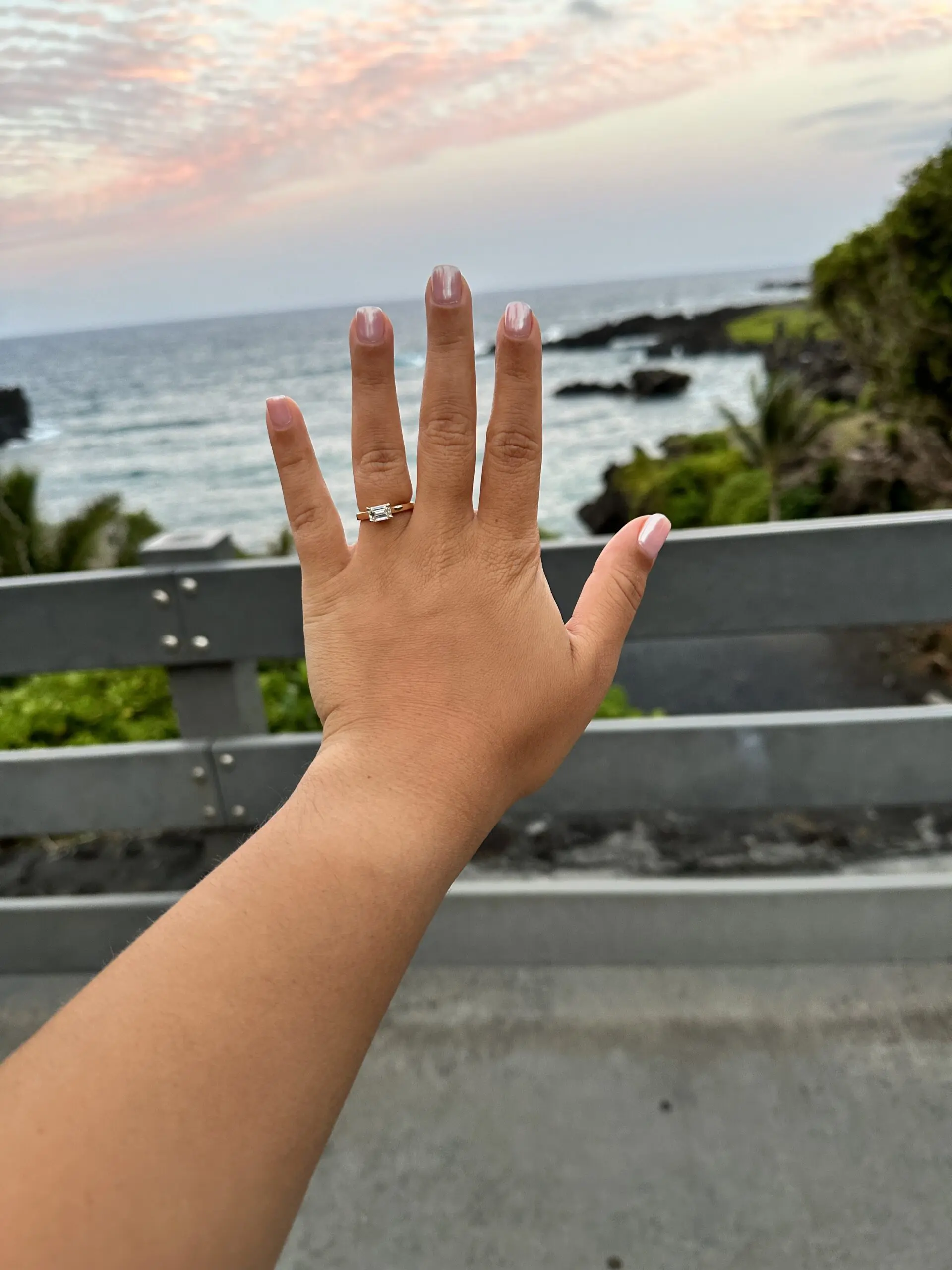 I love the uniqueness to my ring, but also how classy and timeless it can be. I chose just a solid emerald cut, laid east to west on a solid gold band. We did not design it together, but a whole year prior to him proposing, we got to sit down with the amazing team at Diana Rae to get an idea of what I liked. The ring was a complete surprise!
