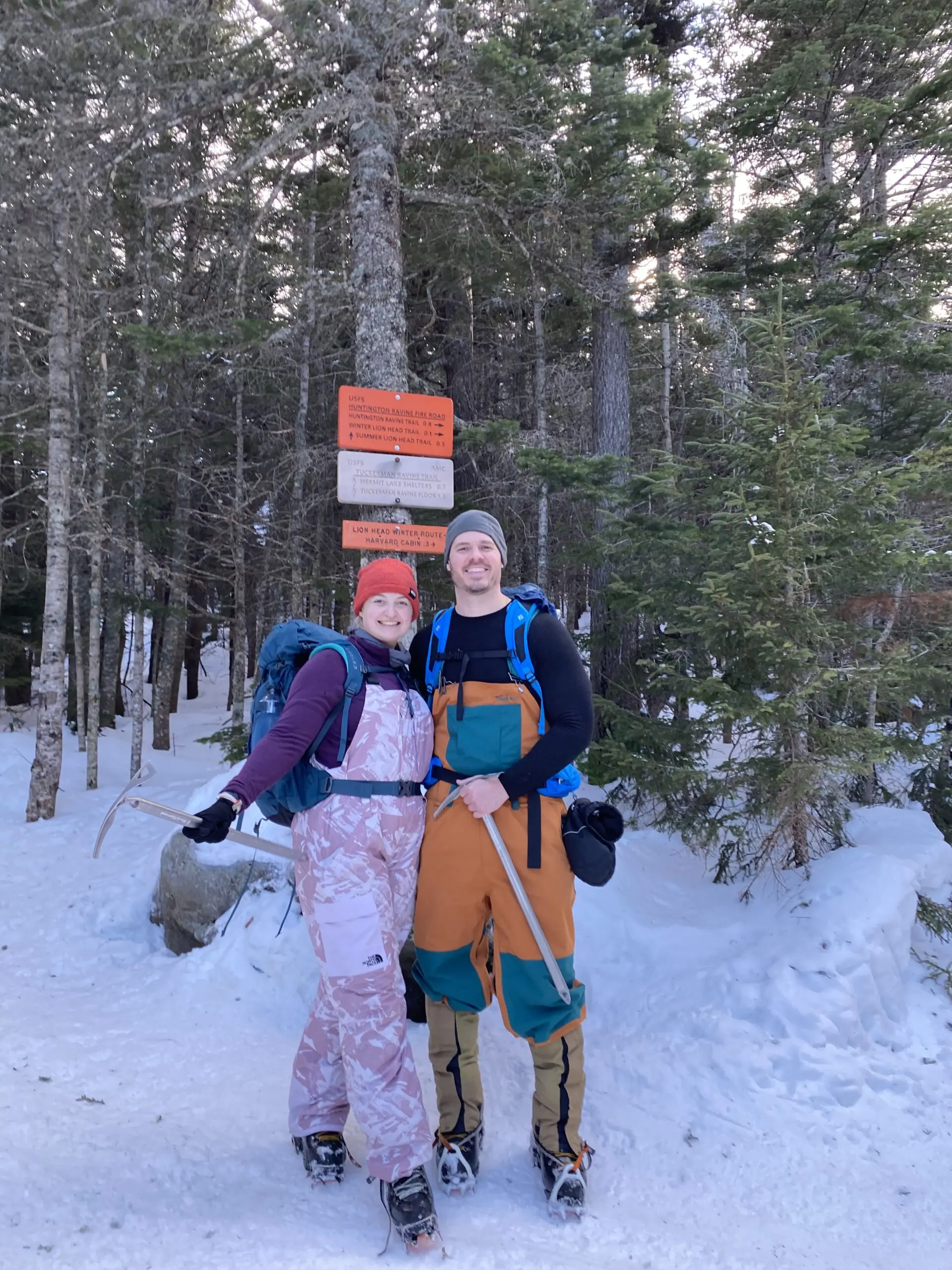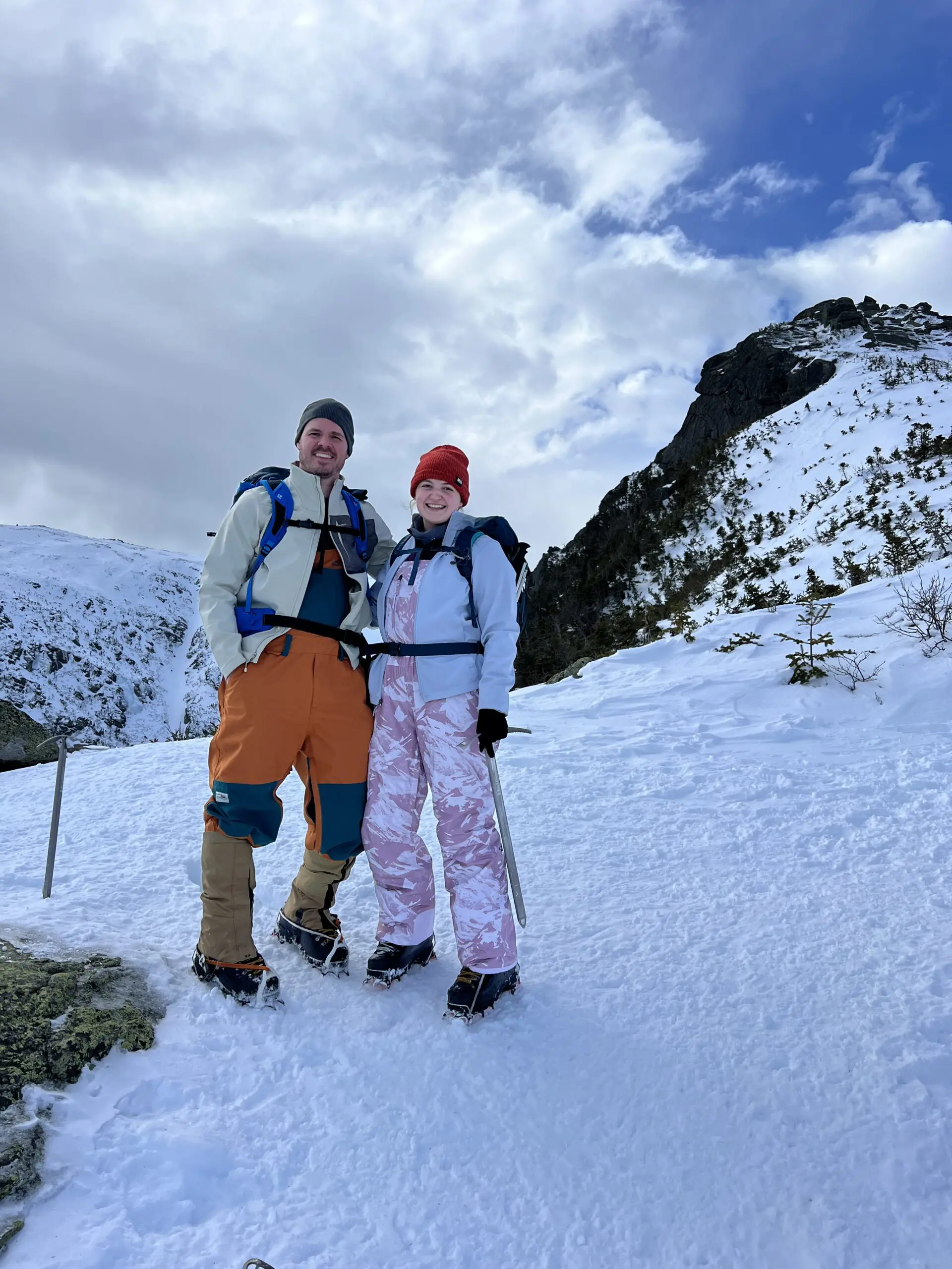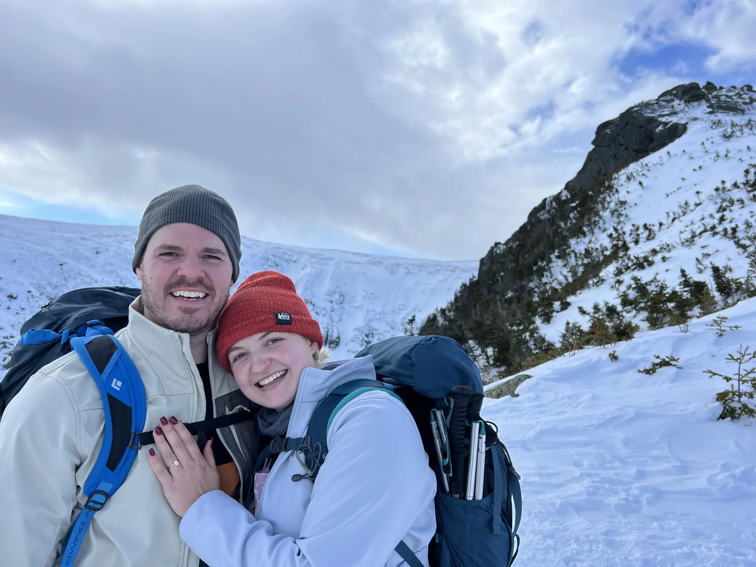 Our proposal was on February 9th, 2024. We traveled to Boston, Massachusetts and then up to Jackson, New Hampshire. He proposed at the summit of the Lion’s Head Trail on Mount Washington. This “hike” was more of an ice climb. With our axes and crampons and mountain guide, we spent 5 hours getting to the top and he proposed near the edge of Tuckerman’s Ravine and Mount Washington’s Summit. He later told me that he had an Apple Airtag in the box with my ring in case it got lost in the climb and snow. He was ready and I had no idea!