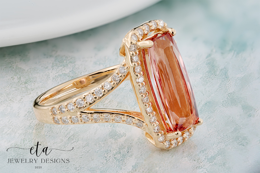Introducing our ETA Collection! This exquisite Rectangular Cushion Imperial Topaz and Diamond Ring is a dazzling fusion of rarity and radiance also known as Amber. Set in 14K Yellow Gold, the orange and pink hues of of the beautifully colored 3.32Ct. Topaz shines through. Diamonds cascade down the split shank band and around the center gem, adding a special sparkle to an already stunning ring!