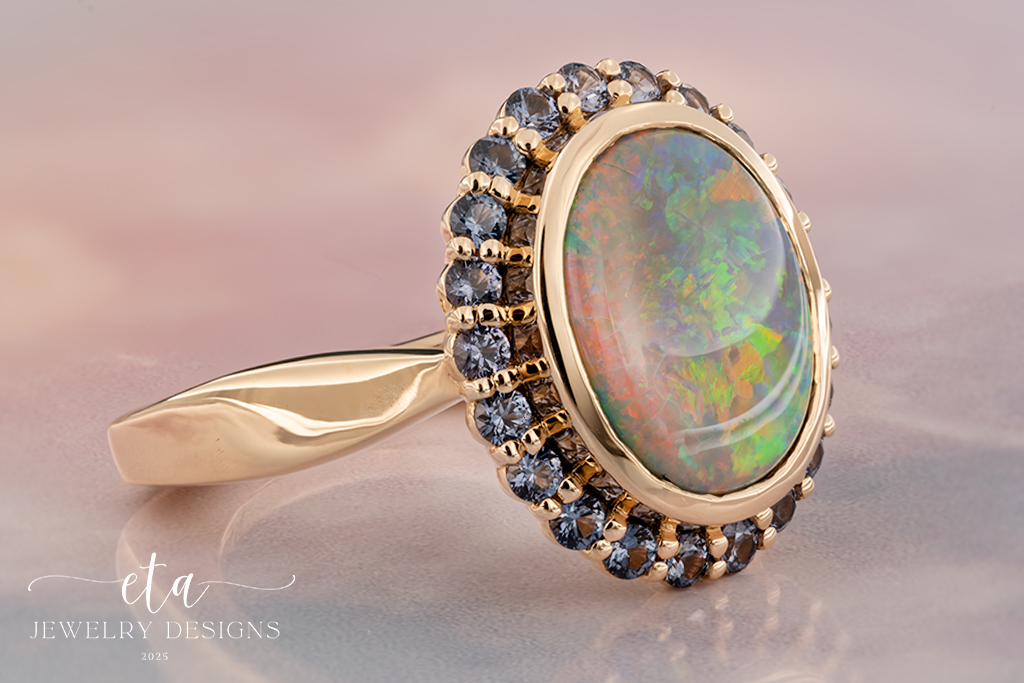 Introducing our ETA Collection! Named Iris, after the Greek word meaning “rainbow”, this ring is a testament to its namesake with the mesmerizing play of color from every angle. Bezel-set in 14K Yellow Gold, the 4.08Ct. Oval Australian Opal center reveals flashes of blues, greens, and oranges with every movement, making it a truly one-of-a-kind gem! Embracing the center stone are 21 Round Lavender Spinels that compliment the darker tones of the Opal perfectly. This ring is truly something spectacular and a wonderful gift for any lover of jewelry!