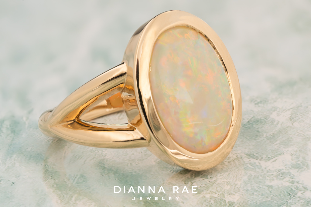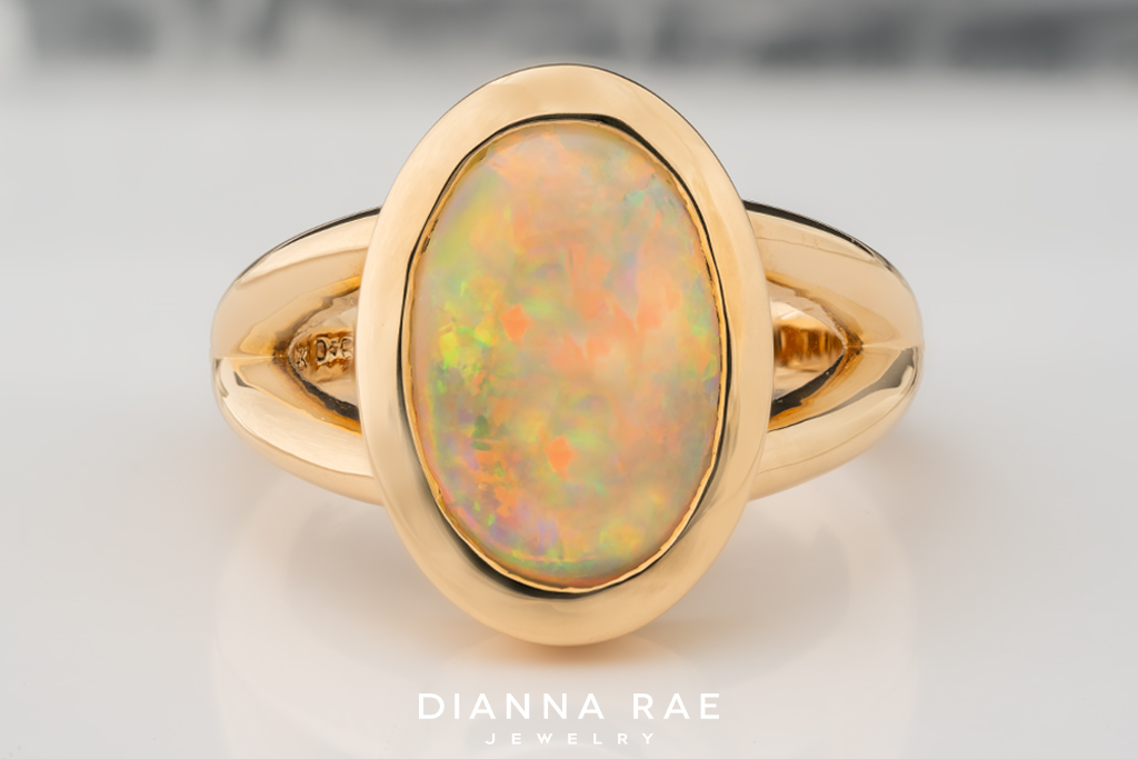 This bold ring is the perfect statement piece! It features a gorgeous 3.79Ct Oval Australian Opal that is Bezel Set in 14K Yellow Gold. This stunning Australian Opal shows off a mesmerizing play of color from every angle, revealing flashes of blues, greens, and oranges with every movement, making it a truly one-of-a-kind gem!