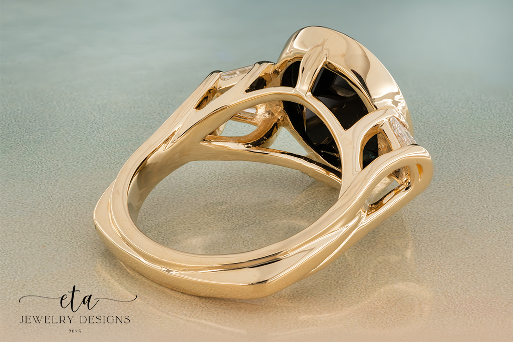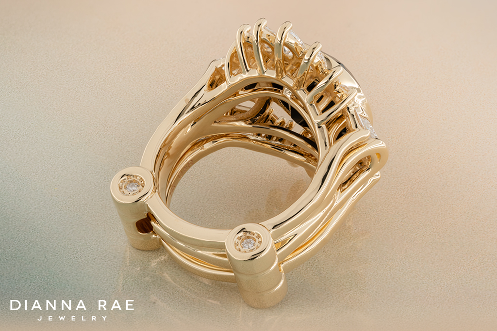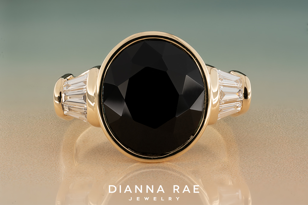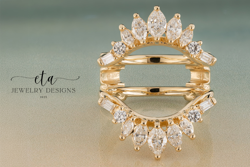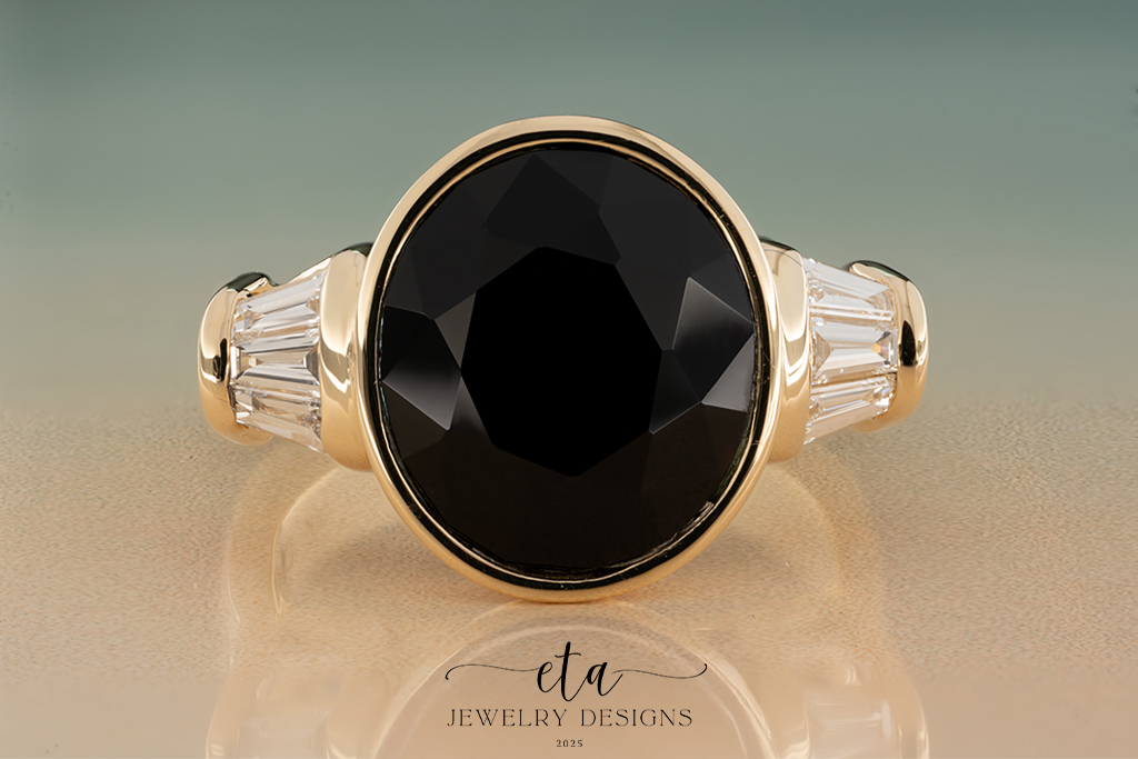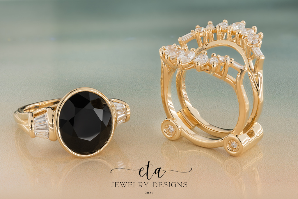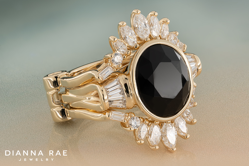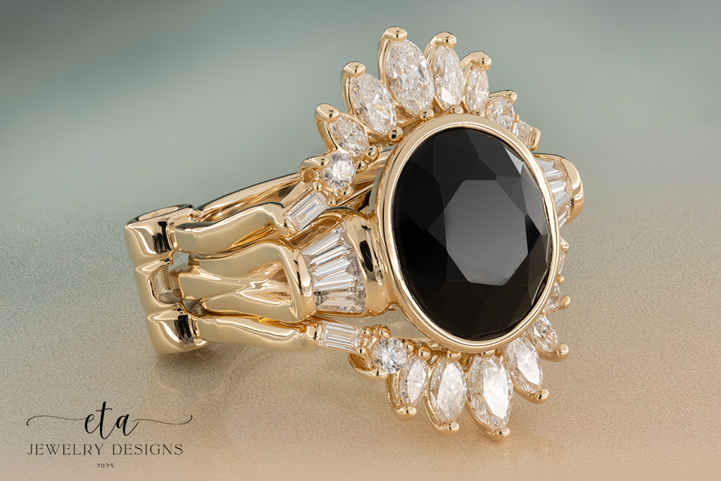 This eye-catching ring is truly something spectacular! At its center is a 14.00×12.00mm Bezel Set Oval Onyx that is compliment by six Baguette VS1-clarity, G/H-color Lab-Grown Diamond accents, that have a total weight of 0.41Ct. This gorgeous design is framed by a stunning ring guard made up of four Baguette VS1-clarity, G/H-color along with ten Marquise VS1-clarity, F/G-color Lab Grown-Diamonds, with the halo having a total weight of 1.20Ct. The ring guard also features four 2.20mm Bezel Set Cubic Zirconia accents. This alluring ring is crafted from 14K Yellow Gold and is sold as a set. This striking piece is perfect for any jewelry lover’s collection!