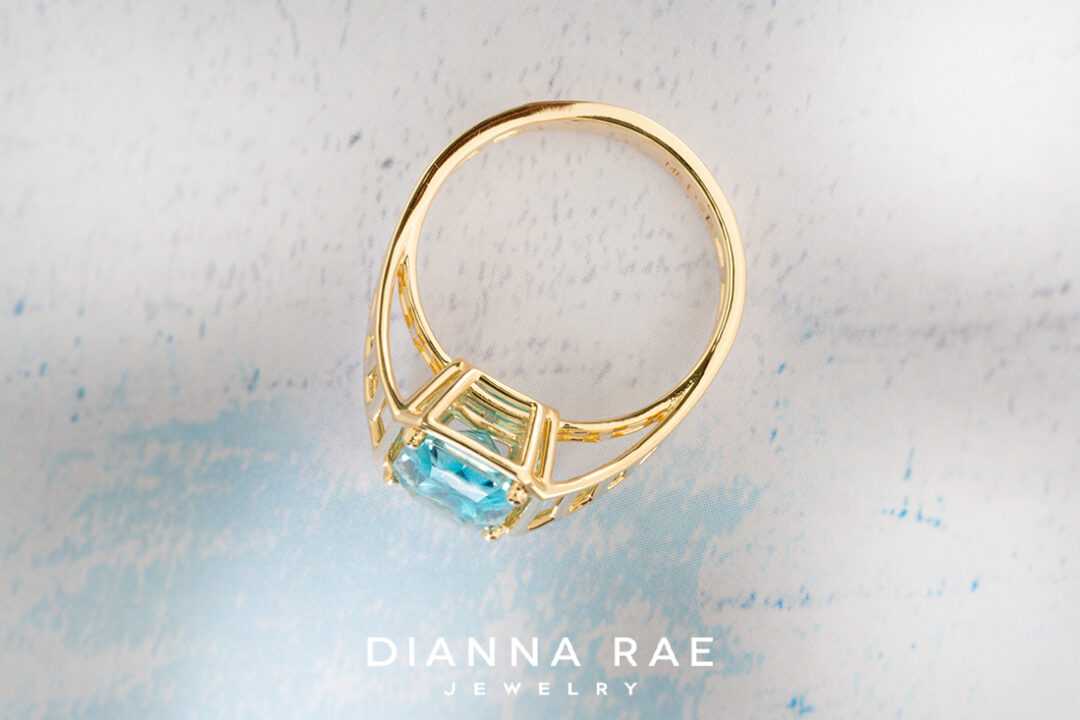 The vivid blue zircon, set in warm yellow gold, creates a striking contrast, while the emerald cut enhances the stone’s natural sparkle. The intricate openwork band adds elegance and ensures a comfortable fit. This ring is perfect as a statement piece or a cherished addition to your jewelry collection.