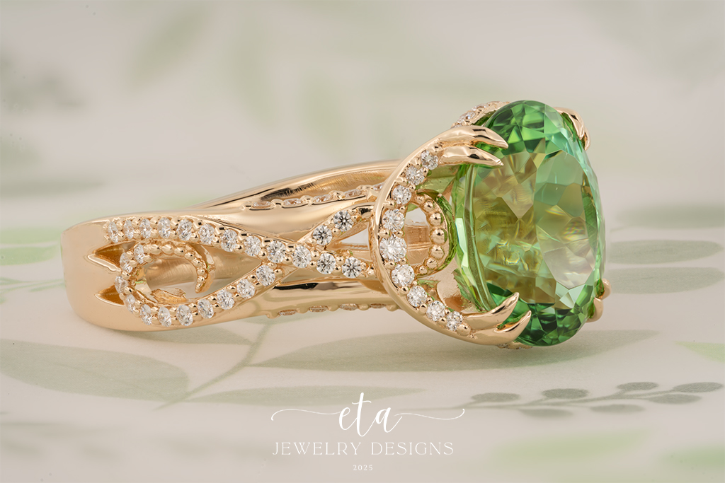 Introducing our ETA Collection! Known as Esmeralda, after the feminine name of Spanish and Portuguese origin that means “emerald”, this ring is designed around an exceptional 5.78Ct. Oval Green Tourmaline. This electric center stone is accented by 115 Natural Diamonds that add an unparalleled brilliance to the piece! Framed in 14K Yellow Gold, the vintage scrolling and double claw prong detail accentuates the glow of the Tourmaline.