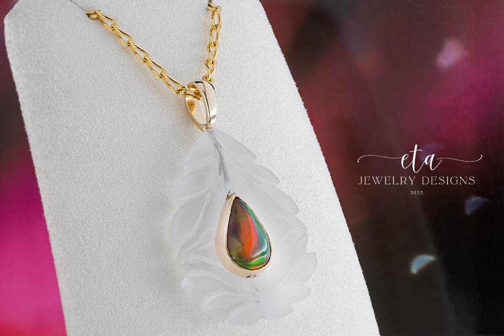 Introducing our ETA Collection! This uniquely beautiful pendant showcases a Bezel-set 1.94Ct. Pear Shape Ethiopian Opal that displays a vibrant play of colors, shimmering with every movement. Surrounding the center stone, is a meticulously cut Carved Quartz that adds to the overall brilliance of the stone. This stunning pendant is displayed with a 14K Yellow Gold 20 inch Figure-Eight Chain, which is included!