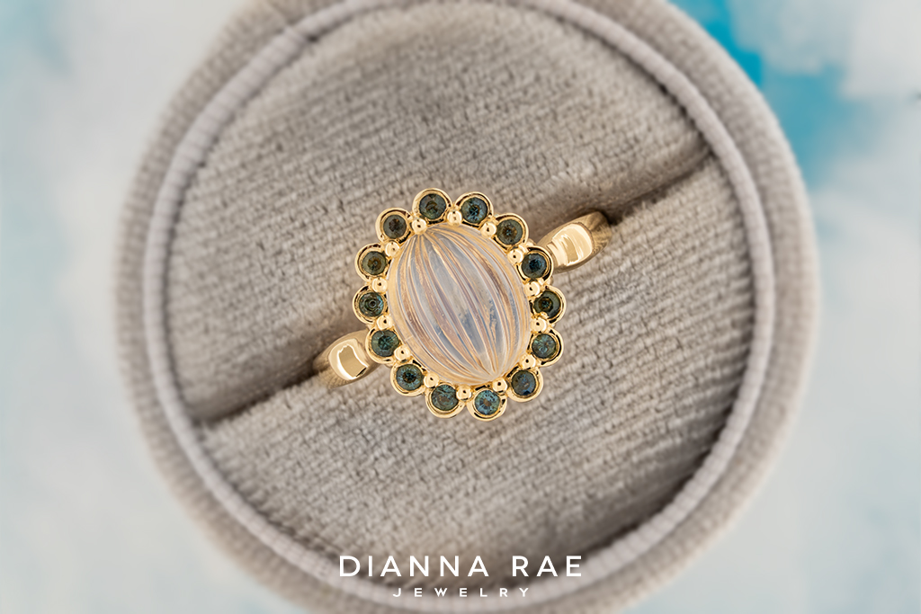 This remarkable ring features a 2.06Ct Oval Fluted Cabochon Moonstone that is framed by fourteen Round Bezel-set Montana Teal Sapphires! To compliment the flashes of blue within the moonstone, the sapphires were hand-selected to surround this ring in 14K Yellow Gold. This lovely ring exudes elegance and glamour that is a definite need for any jewelry lover!