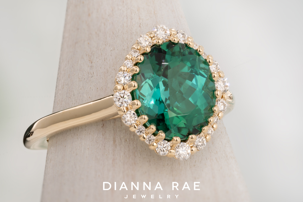 Introducing our stunning Tourmaline and Diamond ring, featuring a captivating 2.99Ct Oval Green Tourmaline at its center. Surrounding the vibrant tourmaline is a halo of exquisite diamonds, all D/E-color and SI2-clarity, with a total diamond weight of 0.21Ct. Set in luxurious 14K Yellow Gold with a Euro Shank, this ring beautifully balances elegance and brilliance, making it an exceptional choice for those seeking a unique and sophisticated piece of jewelry. Perfect for special occasions or as a standout addition to your everyday collection!