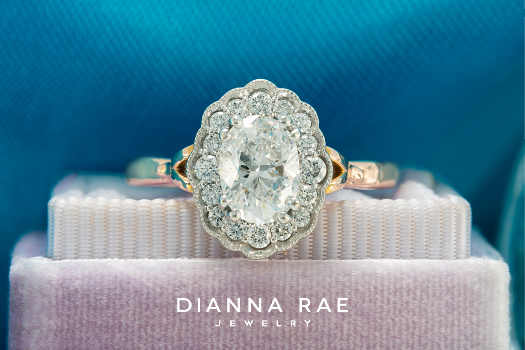 Our Magnolia Dianna Rae Original ring is a breath of fresh air combining old and new design elements for a whimsicle feel. The oval center sits in white gold and is surrounded by a large scalloped and milgrained diamond halo to create a vintage look. Its yellow gold floral under-gallery adds extra romance with petals that gracefully flow onto the band. This ring features a 0.91Ct Oval D-color Si2 Diamond in the center And 16=0.20Tw Round G/H-color Si2 Diamonds in the halo.