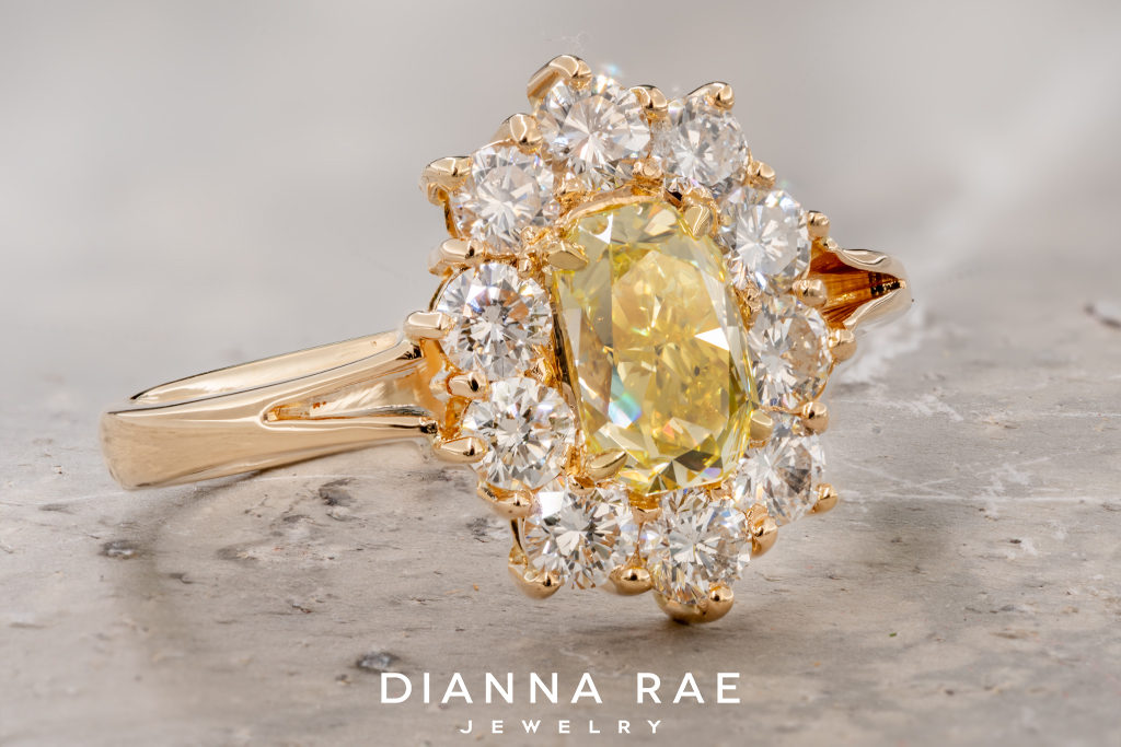 This stunning piece features a captivating centerpiece—a brilliant Radiant 1.01 Carat, VVS2 Clarity, Natural Yellow Diamond, meticulously set in 14K Yellow Gold to showcase its radiant beauty. The warm, golden hue of the diamond adds a touch of luxury and uniqueness to this already exceptional ring. Surrounding the center stone in a gorgeous halo are 10 Round dazzling Diamonds, each contributing to the ring’s overall brilliance. With a combined total weight of 0.77 Carats, these Diamonds enhance the sparkle and glamour, creating a harmonious balance that makes this ring truly enchanting!