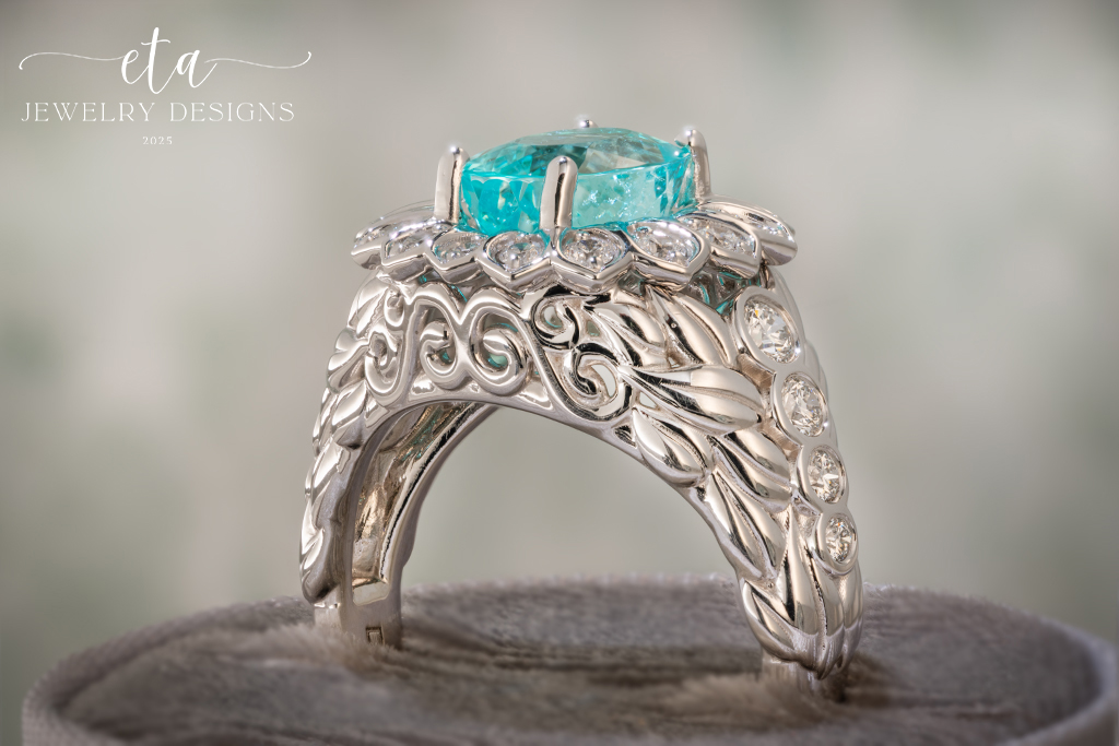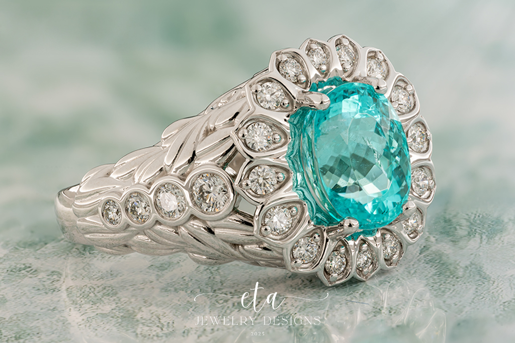 Introducing our ETA Collection! Mara is inspired by the beauty of water and nature, this exquisite ring shows the magic of the rare Paraiba Tourmaline. The stone comes from a mine in Mozambique and is known as a Cuprian Tourmaline, which indicates the element of copper, this gives the stone its eye-catchingly brilliant neon color. Set in 18 Karat White Gold, the center is a 2.66ct Oval Paraiba Tourmaline and adorned with 24 Round Diamonds that have a total weight of 0.55Ct. This ring is simply stunning and an one-of-a-kind piece for any jeweler lover’s collection!