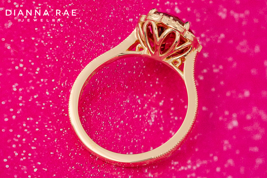 This ring is simply stunning! Sitting perfectly in the center is a 2.91Ct. Oval Pink Tourmaline that is framed by eight Round Natural Diamond Accents as well as four Round Pink Spinels. Beneath the center, the under-gallery flows up from the band in the shape of flower petals to support the ring. This gorgeous ring is complete with milgrain detailing that follows both sides of the band! Crafted in lustrous 14K Yellow Gold with claw prong accents, this ring effortlessly combines classic charm with a modern twist. It’s a symbol of individuality, perfect for any occasion!