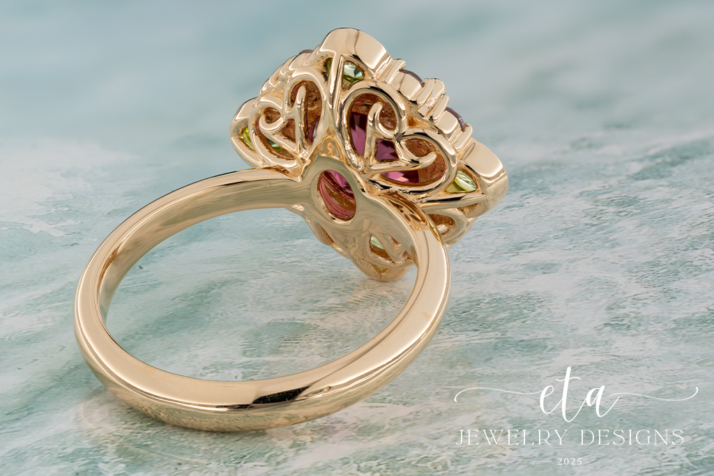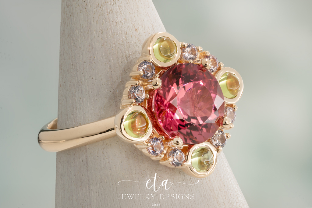 Introducing our ETA Collection! Named Polly, inspired by the idea of Polly Pocket, this ring captures the girlhood charm by having heart detailing on the under gallery. At the center is a 2.87Ct Round Pink Tourmaline that is simply stunning! Framed by four Bezel-set Cabochon Peridots and eight Lavender Spinels, the wonderful array of colors makes this ring truly specular. Set in 14K Yellow Gold, this ring is perfect of any admirer of unique designs and having fun with jewelry!