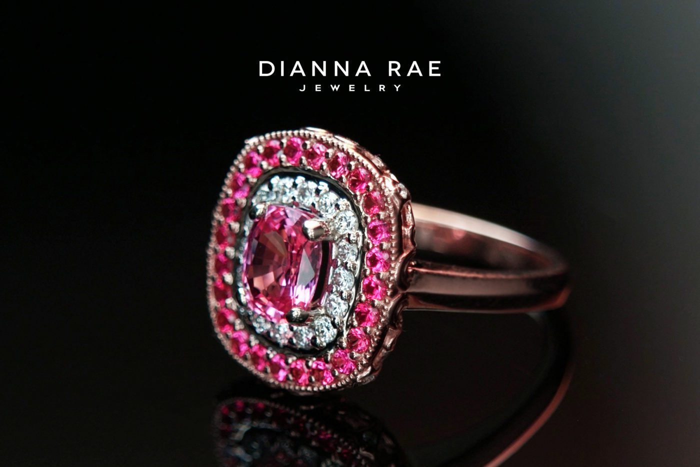 Make a statement with this Dianna Rae Original, Pretty in Pink! This feminine fashion ring features a 1.64 carat natural pink sapphire, framed by a double halo of 16 dazzling diamonds and 24 genuine pink spinel. This two-tone 14 karat white and rose gold ring is complete with Dianna Rae Original scrolls and milgrain accents. Delicate details and sparkling gemstones make this ring an extraordinary piece of art. Diamond total weight is 0.31 carat.