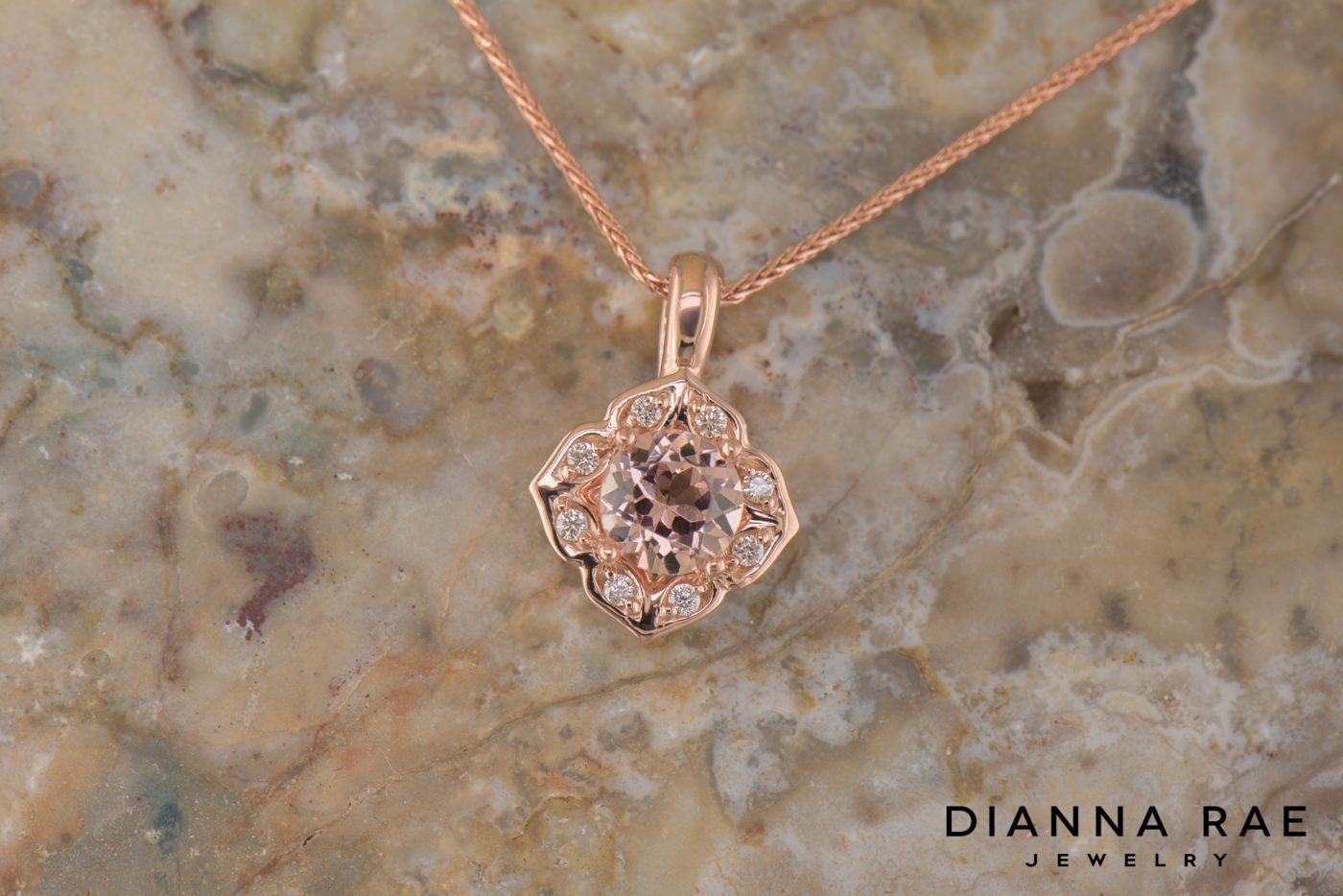 This dainty 14 karat rose gold pendant holds a lotus garnet surrounded by diamonds and is accented by an elaborate halo. The total weight of the round garnet is 0.80 carat.