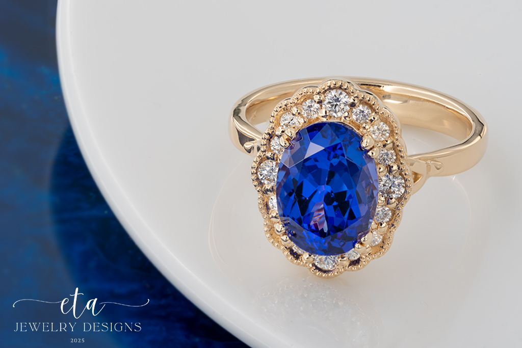 Introducing our ETA Collection! Aster is an exquisite 14K Yellow Gold Ring featuring a captivating 3.34Ct Oval Tanzanite center stone adorned with a stunning milgrain 12 Diamond Accented halo that has a total weight of 0.15Ct. This ring effortlessly combines the allure of deep blue Tanzanite hues with the timeless sparkle of diamonds!
