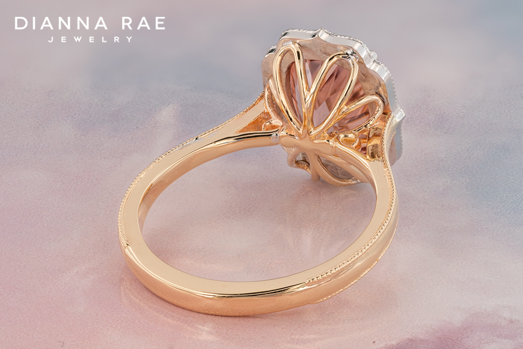 This ring is truly something special! At the center, a 3.82Ct. Cushion Peach Zircon that sits perfectly framed by claw prong accents and milgrain detailing. Surrounding the stunning center stone are 12 Natural Diamonds that come together for a total weight of 0.09Ct., giving the perfect amount of sparkle. With a 14K White Gold head and a 14K Yellow Gold shank, this ring is perfect for those who love to mix metals!
