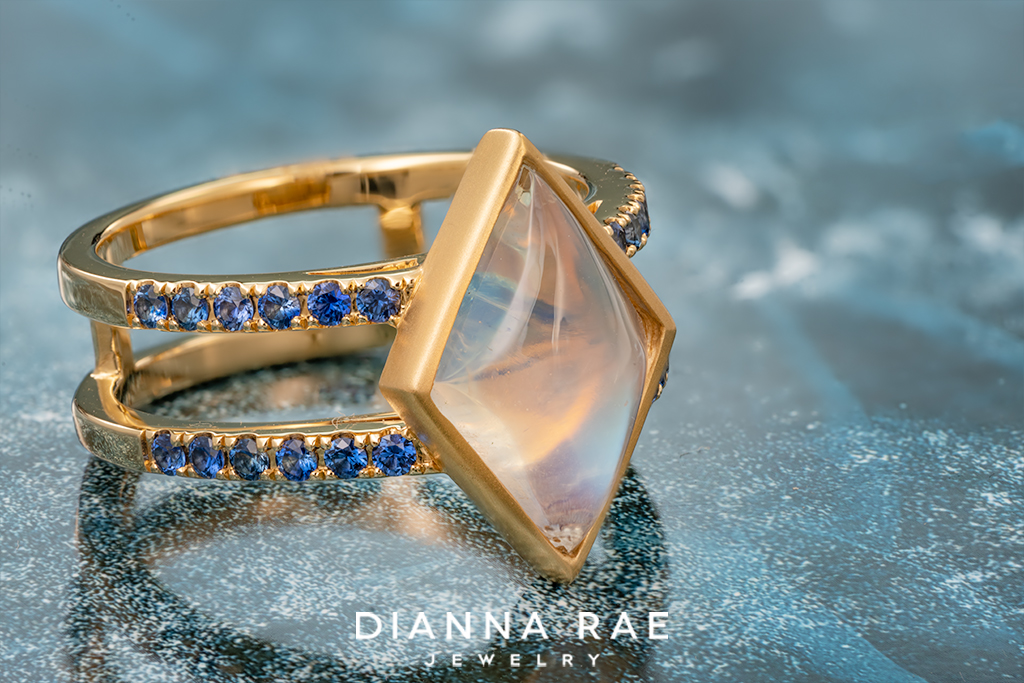 This lovely ring features a 3.34Ct Kite-cut Moonstone at its center and is accented by 24 Round Blue Sapphires, that have a total weight of 0.43Ct. This ring is crafted from 18K Yellow Gold and features a satin finish!