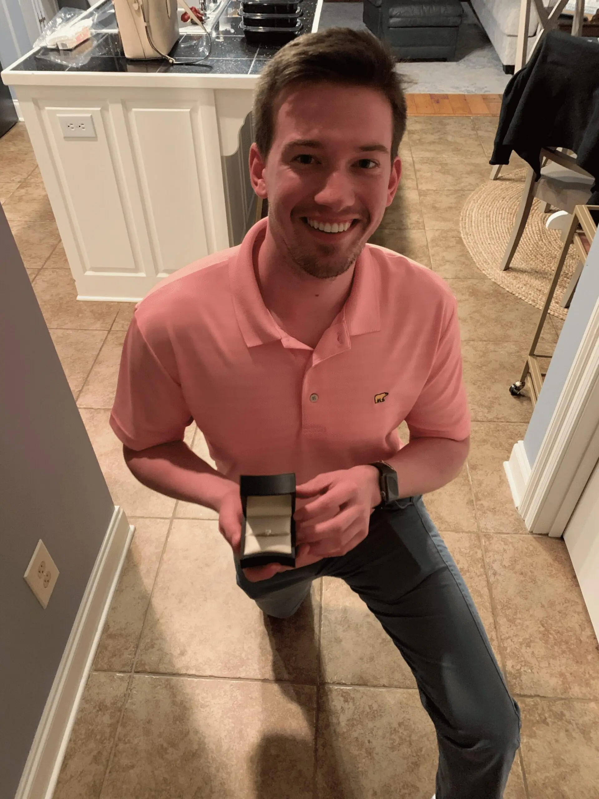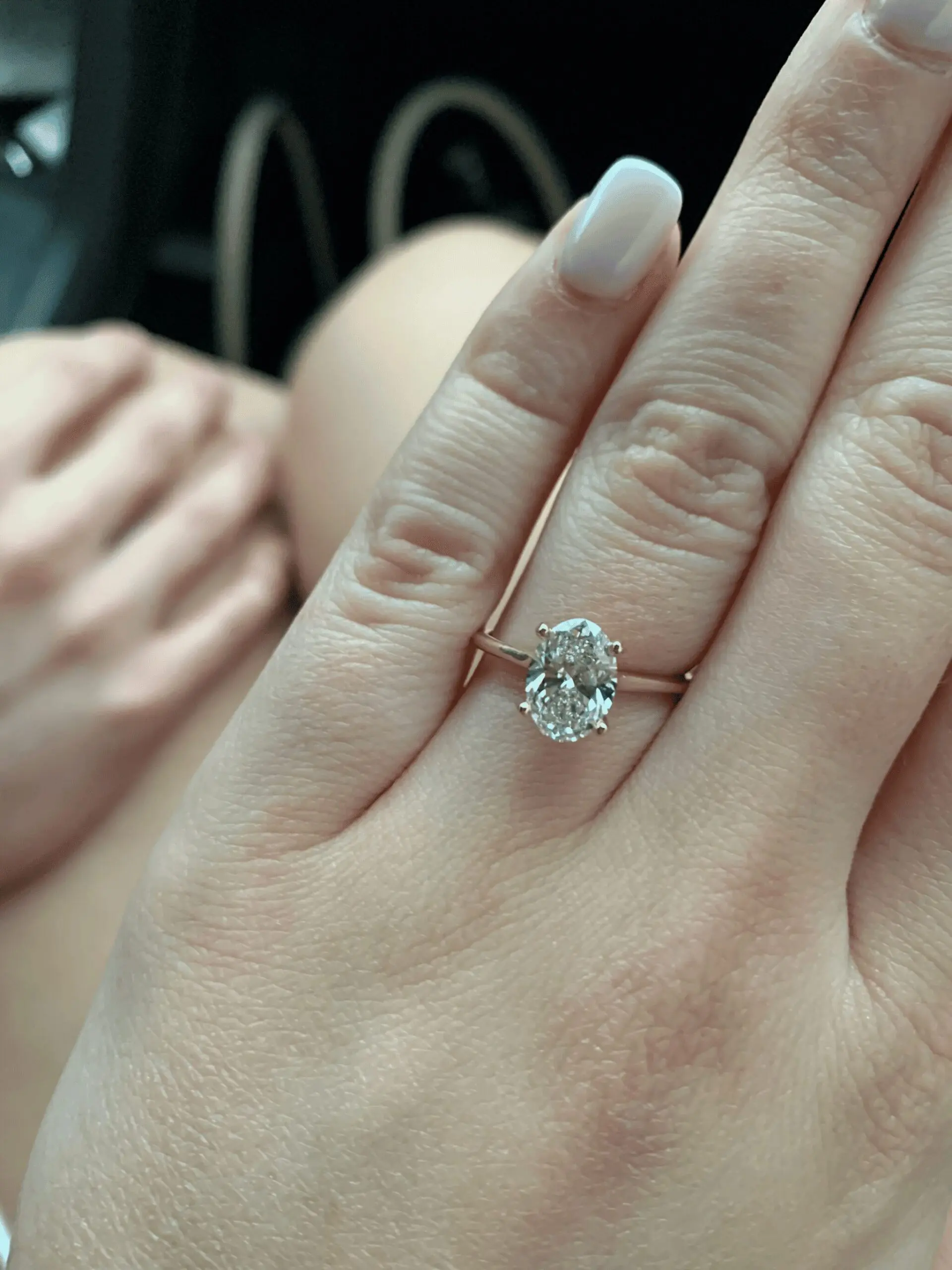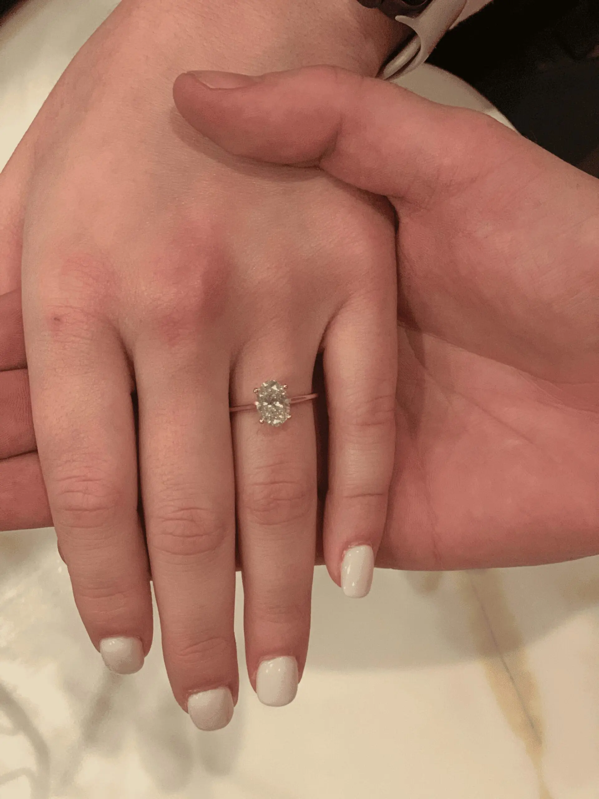My ring is a 1.8 carat oval lab grown diamond on a yellow gold solitaire band. I love the simplicity of this ring and have always known this is the design I wanted. I designed the ring myself with the help of Hannah Landry (who I actually have known since elementary school) and gave Royce the information to purchase it. It is everything I wanted and more! I cannot wait to pair it with my band in September.