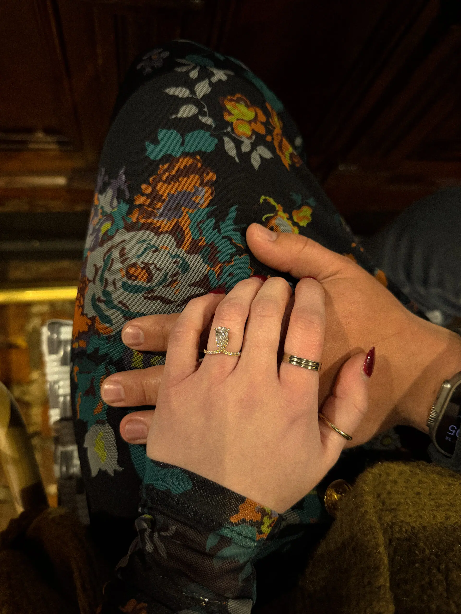 That evening, before our late dinner reservation, my cousin and I planned to take pictures. She suggested getting some engagement photos of them first since they hadn’t taken any engagement photos, Then she started taking pictures of us—and I still wasn’t thinking anything of it. Suddenly in the corner of my eye, I noticed he pulled something out of his pocket, then said a few words, and got down on one knee. I was completely shocked and speechless.
